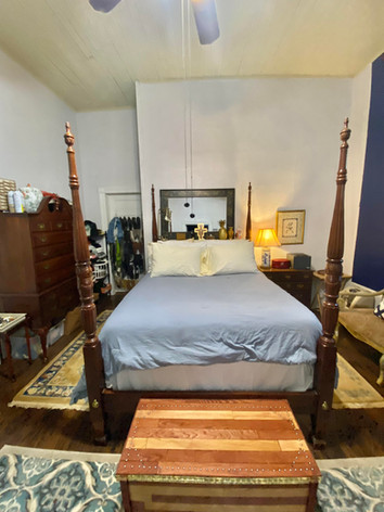Declutter the bedroom by putting away clothes on the floor, bed, and chairs in bedroom